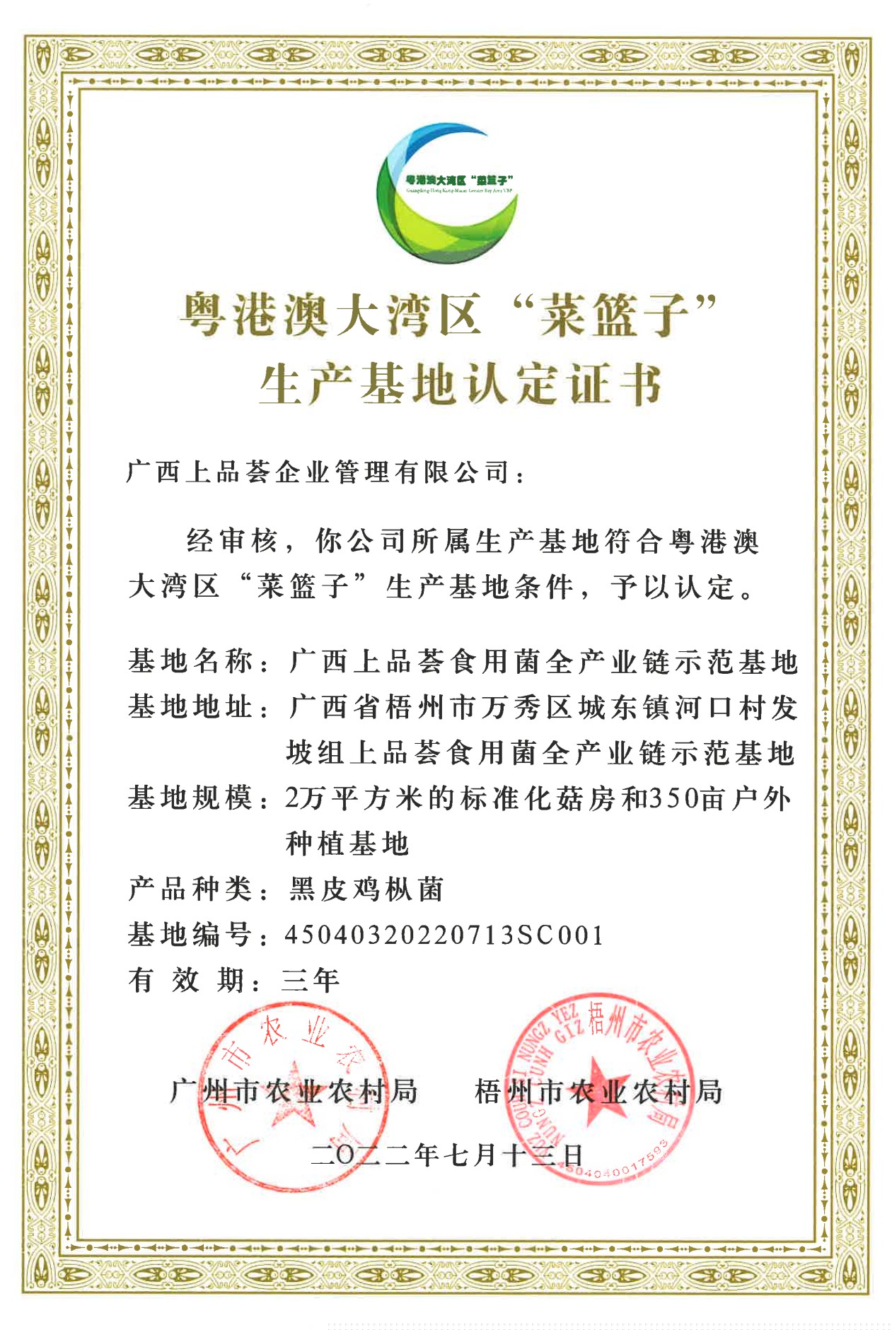 粵港澳區(qū)“菜籃子”生產(chǎn)基地認(rèn)定證書(shū)